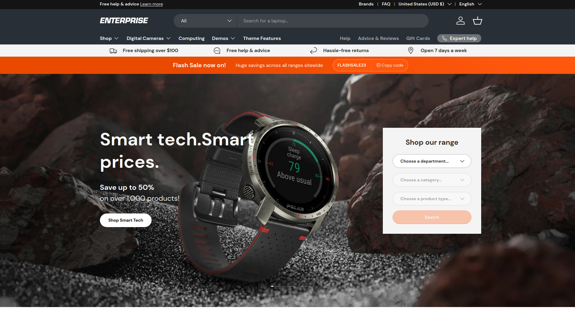 The Enterprise theme features a modern, minimalist design that focuses on usability and clear product presentation. It ensures a professional look, making it ideal for businesses in industries such as fashion, electronics, furniture, or high-end retail.